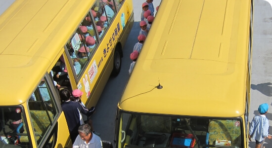 徒歩通園の子どもたちはお家の方と門まで一緒に、またバス通園の子どもたちは園バスがお家付近まで迎えに行くので、おともだちや先生と一緒に仲良く園に向かいます。