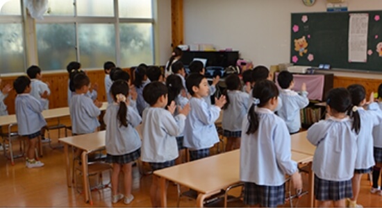 クラスにみんなが登園してきたら、手洗い・うがいを済ませて席へ。お当番さんは前に出て、朝の会をします。