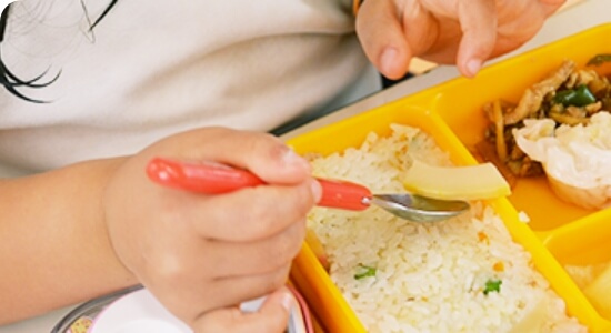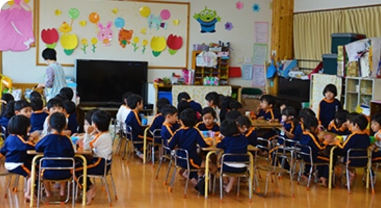 完全給食制なので、みんなで同じものを一緒に食べます。すると、まわりから刺激を受けて今まで食べられなかったものが食べられるようになることもあります。